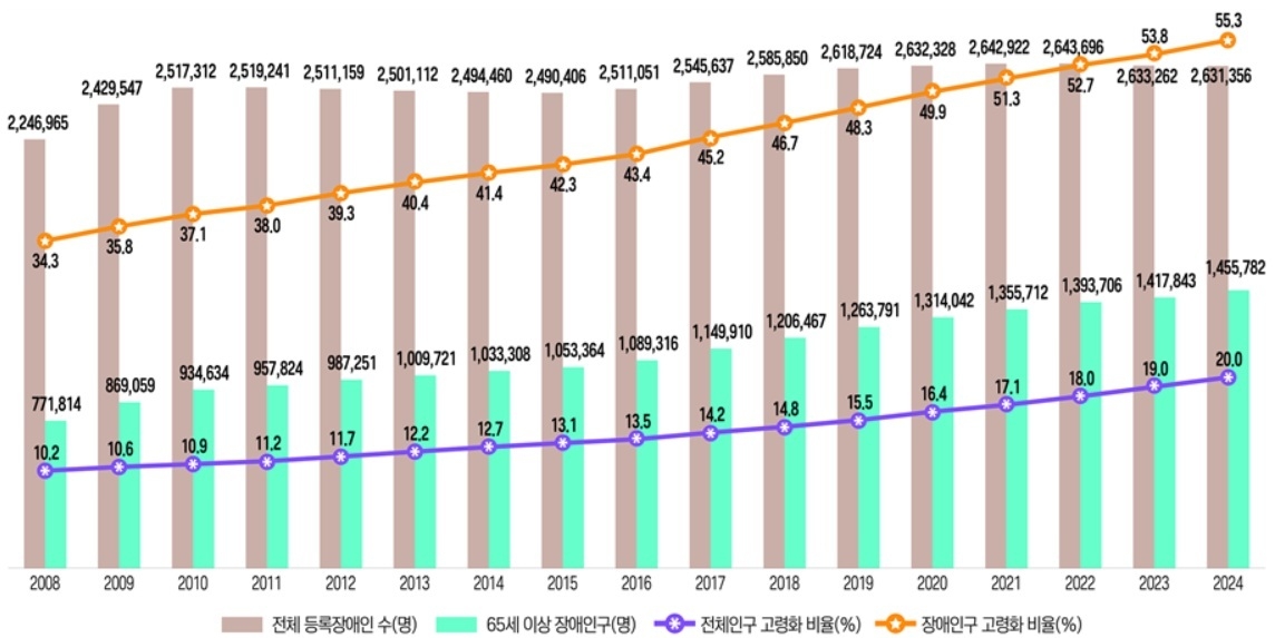65세 이상 등록장애인은 145만 5,782명으로 전체 등록장애인의 55.3%에 달한다. 이는 전체 인구의 고령화 수준(20.0%)과 비교해 무려 35.3%포인트나 높은 수치로, 장애인 사회가 이미 '초고령화'를 넘어선 상태임을 보여준다.