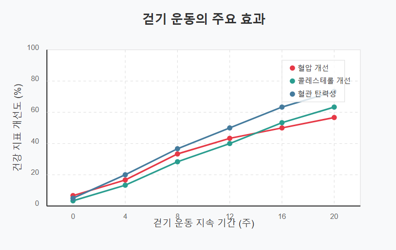 걷기 운동이 혈관 건강에 미치는 긍정적인 영향은 여러 과학적 연구를 통해 입증되었다. 하버드 의과대학의 연구에 따르면 하루 30분 이상 걷기 운동을 꾸준히 한 사람들은 심혈관 질환 발생 위험이 약 30% 감소했다.
