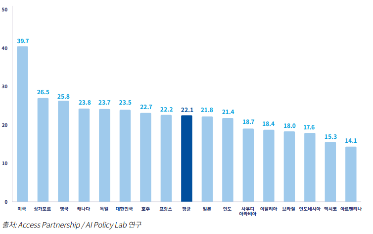 1.8점으로 평균(1.7점)과 비슷한 수준이지만, 여전히 개선이 필요한 분야다. 한국은 강력한 연구 인프라와 성장하는 스타트업 생태계를 보유하고 있으나, 파운데이션 모델과 컴퓨팅 자원에서 대형 플랫폼에 대한 의존도가 높다는 것이 약점으로 지적됐다.