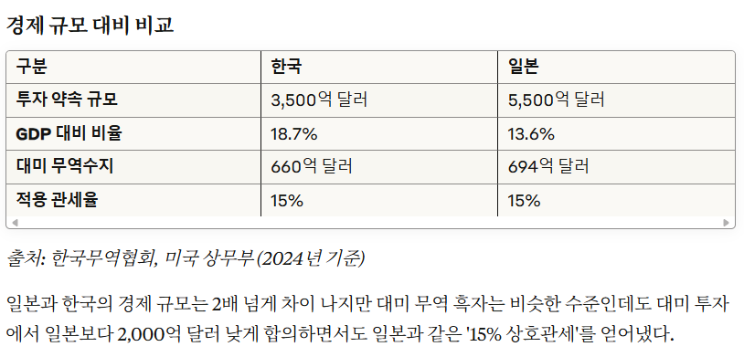 한국은 미국에 대한 상호관세를 25%에서 15%로 낮추는 조건으로 3,500억 달러 규모의 대미 투자를 약속했다. 이는 일본이 약속한 5,500억 달러보다 2,000억 달러 적은 규모다.