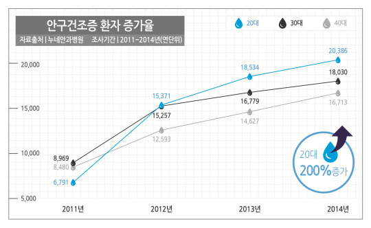사람들은 일반적으로 분당 약 15-20회 눈을 깜빡이지만, 디지털 기기를 사용할 때는 그 빈도가 절반 이하로 줄어든다. 눈 깜빡임이 줄어들면 눈물막이 적절히 형성되지 않아 눈이 건조해지기 쉽다.