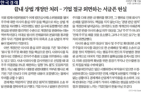 한국경제는 "끝내 상법 개정안 처리…기업 절규 외면하는 서글픈 현실"이라는 사설을 통해 "우리 기업에 불어닥칠 투자 위축과 소송 남발의 부작용이 벌써부터 걱정"이라고 우려를 표명했다. 또한 "경제계와 산업계가 부작용을 호소하며 그토록 반대하는 기업 규제가 기어이 시행되는 현실"에 대한 좌절감을 드러냈다.