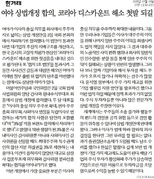 한겨레는 "이 법안이 통과한다면 대기업의 후진적 지배구조를 개선하고, 한국 증시의 고질적 저평가 현상인 '코리아 디스카운트' 해소를 위한 첫걸음을 내디딘 것으로 평가된다"고 환영했다.